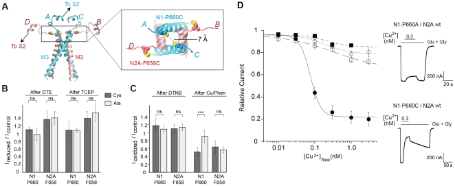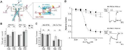 Figure 2. Insertion of a single cysteine in the GluN1 M3-S2 linker results in the creation of a high-affinity copper binding site.(A) The ion-channel (M3 and M3-S2 linkers) region of a modelled tetrameric GluN1/GluN2A receptor viewed from the side (left) and from above the membrane plane (right). In this alternating model (GluN1/2/1/2), the two GluN1 subunits (blue) are in the “proximal” A/C conformation and the two GluN2A subunits (red) in the “distal” B/D conformation. Homologous mutations GluN1-P660C and GluN2A-F658C are highlighted (sulphur in yellow). (B and C) Effects of reducing (B) and oxidizing (C) treatments on current amplitudes of the various cysteine (filled bars) or alanine (empty bars) mutant receptors. Values in B are (from left to right): 1.08 ± 0.05 (n = 8), 0.96 ± 0.15 (n = 7), 1.35 ± 0.2 (n = 14), 1.38 ± 0.16 (n = 8), 1.05 ± 0.22 (n = 9), 1.05 ± 0.06 (n = 11), 1.35 ± 0.16 (n = 20), 1.49 ± 0.2 (n = 6). Values in C are (from left to right): 1.18 ± 0.18 (n = 32), 1.09 ± 0.08 (n = 8), 1.1 ± 0.11 (n = 13), 1.13 ± 0.08 (n = 4), 0.51 ± 0.11 (n = 28), 0.90 ± 0.15 (n = 19), 0.65 ± 0.15 (n = 20) and 0.56 ± 0.08 (n = 8). (D) Copper inhibition dose-response curves for wild-type (open circles; Inhibmax = 21%, IC50 = 0.19 nM, nH = 1.3), GluN1wt/GluN2A-F658C (open squares; Inhibmax = 34%, IC50 = 0.33 nM, nH = 0.7), GluN1-P660C/GluN2Awt (filled circles; Inhibmax = 78%, IC50 = 0.075 nM, nH = 3) and GluN1-P660A/GluN2Awt receptors (filled squares; Inhibmax = 15%, IC50 = 0.21 nM, nH = 1.5). Right: current traces illustrating the inhibition of GluN1-P660A/GluN2Awt (top) and GluN1-P660C/GluN2Awt (bottom) receptors by 0.3 nM free copper. *** corresponds to P<0.001; ns, non-significant; Student’s t-test.