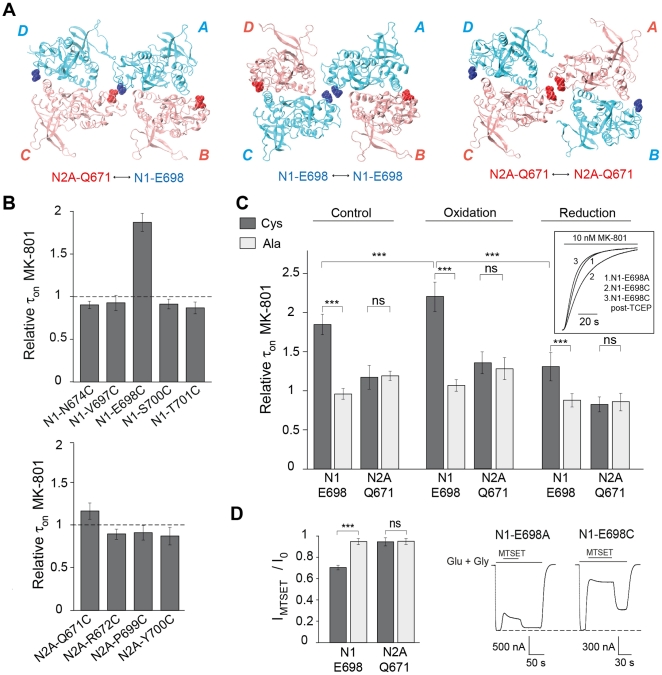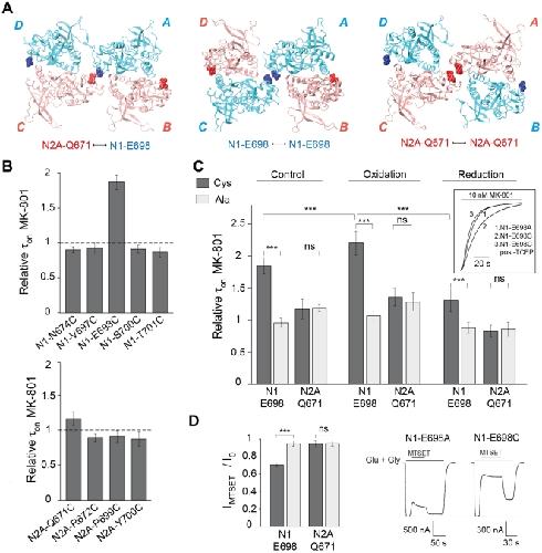 Figure 3. Disulfide cross-linking at the putative ABD dimer-of-dimers interface between GluN1, but not GluN2A, subunits.(A) Three possible arrangements viewed from the membrane region of GluN1/GluN2A ABD heterodimers in a NMDAR based on GluA2 structure. Mutated residues GluN1-E698 and GluN2A-Q671 are highlighted in blue and red, respectively. The residues either lie at the dimer-of-dimers interface in the proximal A/C subunits or protrude towards the exterior surface of the receptor in the distal B/D subunits. (B) MK-801 inhibition kinetics for various GluN1 (top) and GluN2A (bottom) mutants. Values are (from left to right): 0.9 ± 0.04 (n = 5), 0.93 ± 0.09 (n = 9), 1.85 ± 0.13 (n = 20), 0.91 ± 0.05 (n = 8), and 0.87 ± 0.06 (n = 7) for GluN1 mutants; 1.17 ± 0.15 (n = 21), 0.90 ± 0.06 (n = 11), 0.91 ± 0.09 (n = 11) and 0.87 ± 0.1 (n = 11) for GluN2A mutants. All GluN1 mutant subunits were co-injected with GluN2A wt and all GluN2A mutant subunits with GluN1 wt. (C) Effects of redox treatments on the MK-801 inhibition kinetics for cysteine (filled bars) or alanine (empty bars) mutants. Values are (from left to right): control conditions, 1.85 ± 0.13 (n = 20), 0.96 ± 0.07 (n = 12), 1.17 ± 0.15 (n = 21), 1.19 ± 0.06 (n = 9); after incubation with Cu/Phen (oxidation): 2.21 ± 0.18 (n = 12), 1.07 ± 0.07 (n = 10), 1.28 ± 0.14 (n = 18), 1.36 ± 0.14 (n = 9); after subsequent incubation with TCEP (reduction): 1.31 ± 0.18 (n = 19), 0.88 ± 0.08 (n = 7), 0.83 ± 0.09 (n = 17), 0.86 ± 0.11 (n = 9). Inset: MK-801 inhibition kinetics are slower in non-treated GluN1-E698C/GluN2Awt receptors (2) than in non-treated GluN1-E698A/GluN2Awt receptors (1) or TCEP-treated GluN1-E698C/GluN2Awt receptors (3) (normalized currents). (D) Effects of MTSET application on current amplitudes for cysteine (filled bars) or alanine (empty bars) mutants. Values are (from left to right): 0.70 ± 0.02 (n = 18), 0.95 ± 0.03 (n = 11), 0.95 ± 0.04 (n = 9) and 0.95 ± 0.02 (n = 5). Right: current traces illustrating the effects of MTSET on GluN1-E698A/GluN2Awt and GluN1-E698C/GluN2Awt receptors. *** corresponds to P<0.001; ns, non-significant; Student’s t-test.