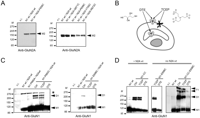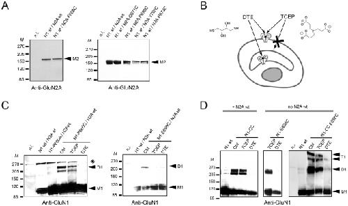 Figure 4. Intracellular and plasma-membrane pools of disulfide cross-linked receptors.(A) Immunoblots from Xenopus oocytes expressing either wt or GluN2A mutant receptors. (B) Schematic representation of a cell expressing intracellular and plasma-membrane pools of receptors with intersubunit disulfide cross-links. Because of their differential membrane permeability, the reducing agent DTE acts on both pools while the reducing agent TCEP acts solely on the cell surface pool. (C) Immunoblots from oocytes expressing either wt or GluN1 mutant receptors. (D) Immunoblots from occytes injected either with both GluN1 and GluN2A subunits or with the GluN1 subunit alone. M1 indicates the expected band position of the GluN1 monomer (∼110 kDa); M2, the GluN2A monomer (∼180 kDa); D1, the GluN1 homodimer (∼220 kDa) and T1 the approximate location of the GluN1 homo-trimer and/or homo-tetramer (>300 kDa). CC stands for mutations GluN1-N521C-L777C (in ABD intradimer interface). M stands for molecular weight marker and n.i. for non-injected oocytes. * indicates non-specific bands seen with the anti-GluN1 antibody.