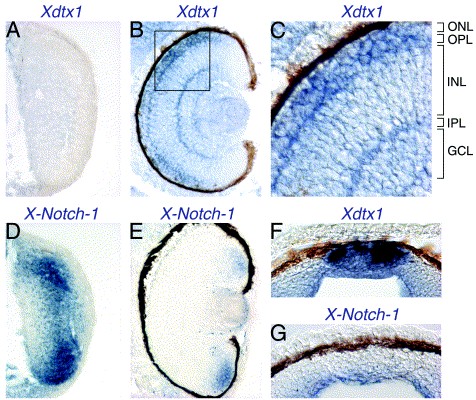 Fig. 3. Expression of Xdtx1 in the eye and in the frontal organ. Transversal sections of whole-mount processed embryos at stage 32 (A,D) and stage 40 (B,C,EâG), cut at the level of the eyes (AâE) and the frontal organ (F,G). The boxed area in (B) is shown in (C) at higher magnification. ONL, outer nuclear layer; OPL, outer plexiform layer; INL, inner nuclear layer; IPL, inner plexiform layer; GCL, ganglion cell layer.