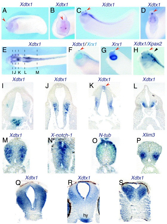 Fig. 2. Expression pattern of Xdtx1. The probes used are indicated on the top of each panel. (AâH) Whole-mount in situ hybridizations. (A,B) Stage 26: lateral view, anterior to the left (A) and frontal view, dorsal to the top (B). (CâH) Stage 32: lateral views, anterior to the left (C,FâH), frontal view, dorsal to the top (D) and dorsal view, anterior to the left (E). (IâP) Transversal sections of whole-mount processed embryos at stage 32. Sections from (I) to (M) are progressively ordered along the rostro-caudal axis, as shown in (E), and correspond to telencephalon (I), anteriordiencephalon (J), posteriordiencephalon (K), hindbrain (L) and spinal cord (M). (NâP) Spinal cord sections. (QâS) Transversal sections of whole-mount processed embryos at stage 40 corresponding to telencephalon (Q), diencephalon (R) and hindbrain (S). hy, hypothalamus. The red arrowheads point to the pineal complex while the black arrowhead indicates Xpax2 expression at the midbrainâhindbrain boundary.