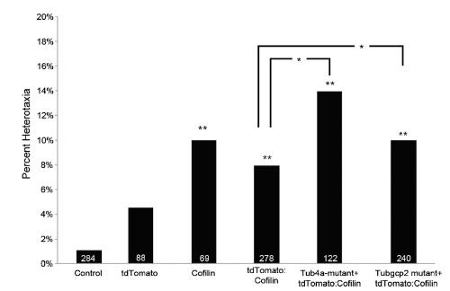 Fig. S4. Heterotaxia rates in tdTomato:Cofilin-a1 coinjections. Embryos injected with cofilin constructs were scored for positioning of the heart, gut, and gall bladder at stage 45. All of the cofilin constructs, but not the controls (injected with the fluorescent protein tdTomato alone) exhibited low but significant levels of heterotaxia. Nâs are given in the figure; Studentâs t test was used for significance calculations; *P < 0.05, **P < 0.01.