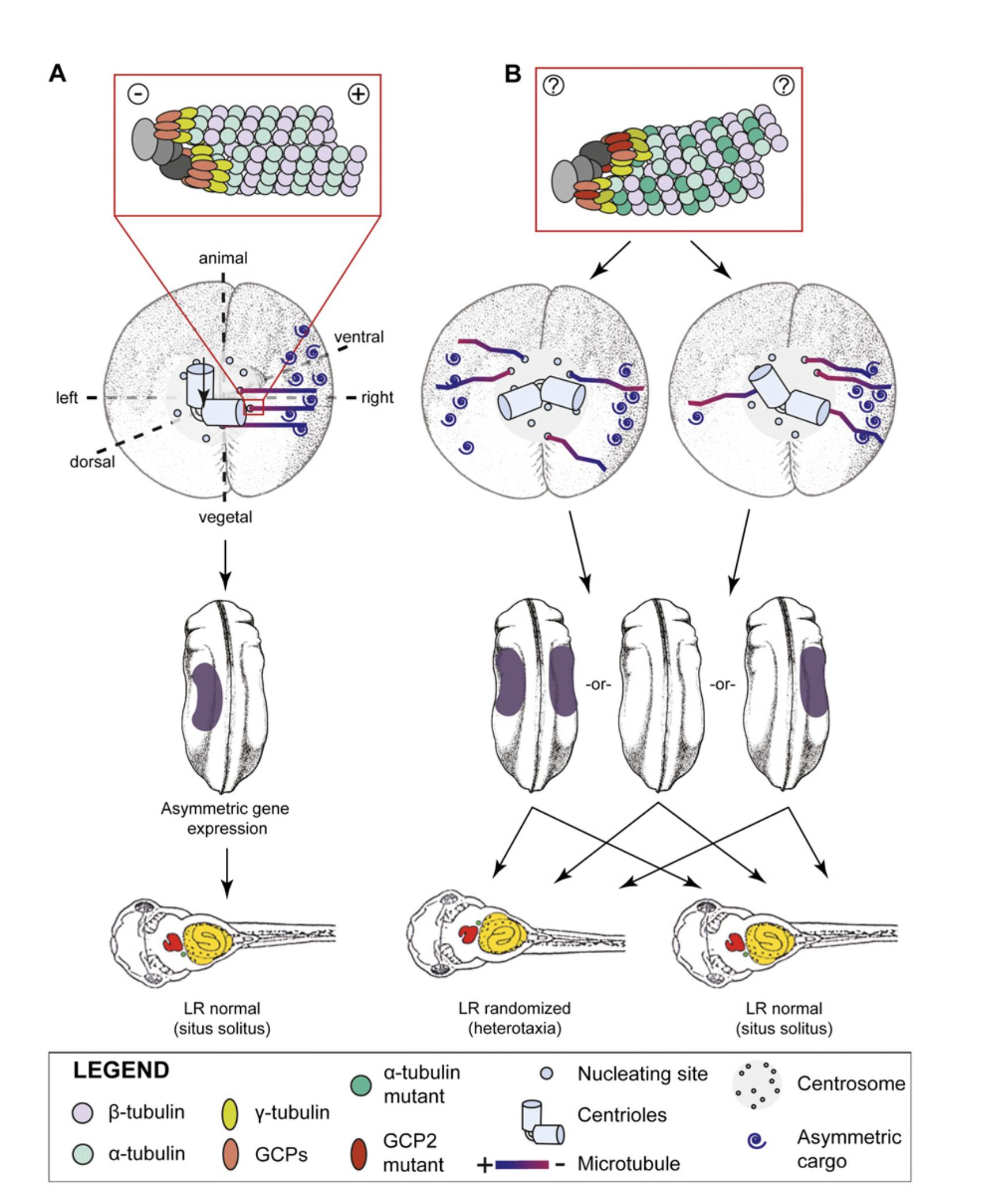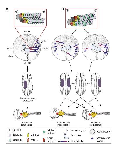Fig. S5. A model for tubulin’s role in LR asymmetry in Xenopus embryos. (A) In unperturbed embryos, the right-biased cytoskeleton (1, 2) is likely to derive from the orientation of the microtubule organizing center (centriole) with respect to the dorso-ventral and animal-vegetal axis, as proposed originally for a chiral “F-molecule” (3). Correct function of both α-tubulin (determining the structure of the microtubules along the animal-vegetal axis, and those involved in the dorso-ventral axis induction at cortical rotation shortly after fertilization) and γ-tubulin (mediating anchoring of LR-oriented microtubules to the MTOC) results in the proper linkage of the MTOC to the two axes, allowing intracellular transport of LR determinant cargo molecules (4) to the right side, which ultimately results in correct organ situs. (B) Mutations in the GTPase-activating domain of tubulin suppress correct microtubule dynamics and promote po- lymerization (5). Thus, the previously described (1) subtle right-ventral bending of the cytoskeleton would be altered when mutated α-tubulin and γ-tubulin subunits were introduced at the early one-cell stage. In the absence of rightward intracellular transport of maternal proteins important for subsequent LR patterning steps, the downstream steps are randomized, resulting in a mixture of wild-type and heterotaxic embryos.