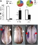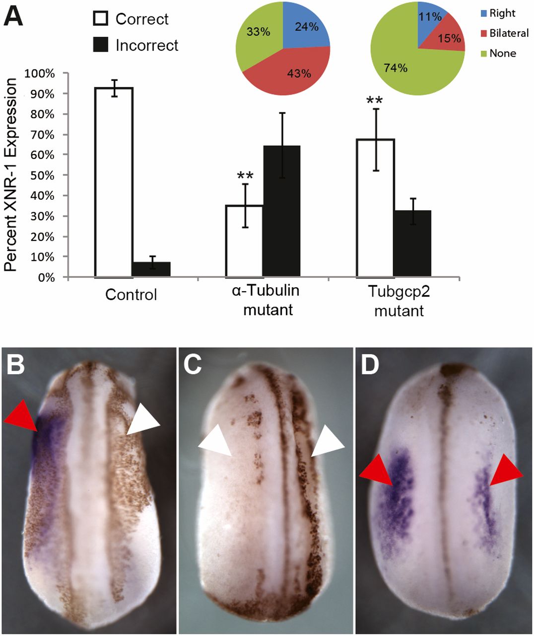 Fig. 2. Tubulin mutations perturb sidedness of asymmetric gene expression in Xenopus. Embryos injected with either tub4a mutant or Tubgcp2 mutant were processed for in situ hybridization at stage 22 with an Xnr-1 probe. (A) Both tubulin mutants deviated significantly (denoted with double asterisks) from control embryos (Tub4a: 64.7% incorrect expression, n = 51, P < <0.01 Welchâs t test; Tubgcp2: 32.5% incorrect expression, n = 83; control: 7.33% incorrect expression, n = 150, P < <0.01 Welchâs t test). (BâD) Xnr-1 expression pattern (purple stain) characterized in tubulin mutant mRNA-injected embryos. (B) Left expression indicated by one red arrow and one white arrow. (C) Absence of expression as indicated by two white arrows. (D) Bilateral expression as indicated by two red arrows.