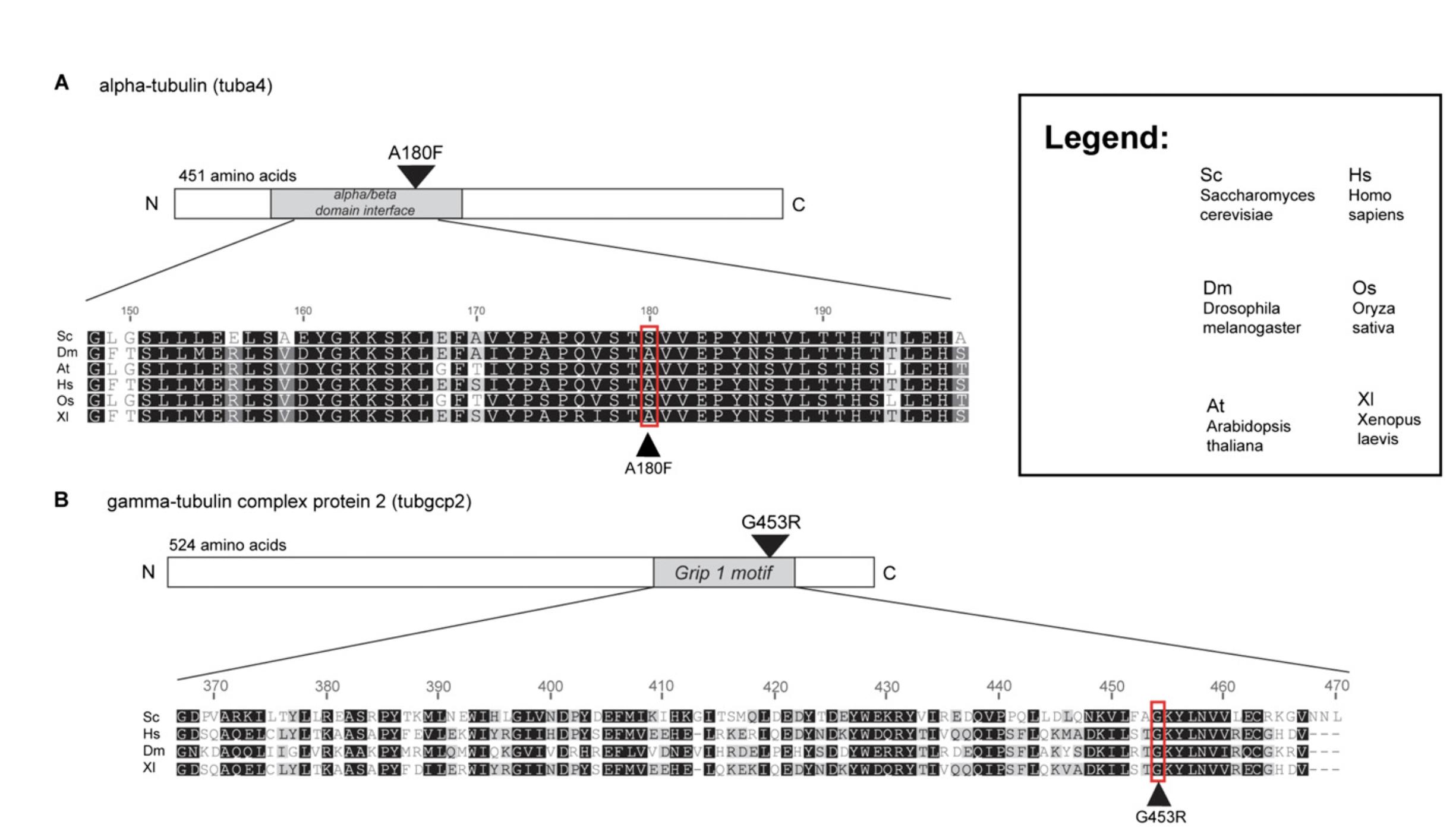 Fig. S1. α-Tubulin and the γ-tubulin associated protein complex, Tubgcp2, are highly conserved among organisms. (A) Amino acid sequence alignment of the alpha/beta domain interface in various alpha tubulin orthologs. The conserved Ala180 (indicated with an arrowhead) was substituted with Phe in Xenopus laevis α-Tubulin mutants, as in the lefty2 Arabidopsis mutants. (B) Amino acid sequence alignment of the Grip motif 1 in various GCP2 orthologs (known as Tubgcp2 in Xenopus). The conserved Gly453 was substituted with Arg in Tubgcp2 mutants, as in spr3 Arabidopsis mutants.