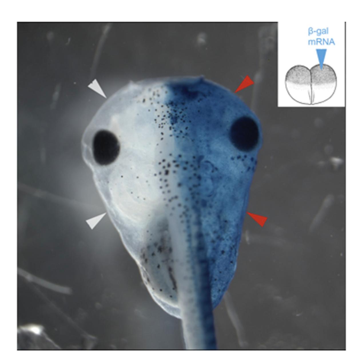 Fig. S3. Injection into one of two early blastomeres allows targeting of the left or right side of embryo. Embryos were injected in one blastomere of the two- cell frog embryo with mRNA encoding the enzyme β-galactosidase. At stage 45, the embryos were developed using a chromogenic reaction, illustrating that mRNA injected in this manner targets cells on one side of the embryo. The first cleavage plane is indeed usually aligned with the prospective LR midline of the embryo; as in numerous studies, where one blastomere injection at the two-cell stage allows the other side to serve as an unaffected contralateral control, this confirms our ability to target early injections of cofilin to one side or the other.