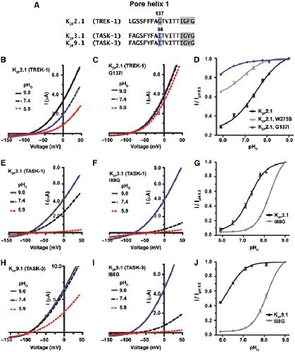 Figure 2. PH1 is critical for K2P channels C-type gating. (A) Amino-acid alignment of the PH1 region of the indicated K2P channels. The GXG selectivity filter sequence is highlighted in grey. (B, C, E, F, H, I) Exemplar recordings of the response of the indicated K2P channels to the external pH (pHo) changes in 2 mM [K+]o solution. Currents were elicited by a voltage ramp from −150 to +50 mV, from a holding potential of −80 mV. (D, G, J) Quantitation of the response of the K2P channels to changes in pHo. Data (mean±s.e., n⩾6, N⩾2) was taken at 0 mV, normalized to activity at pH 9.0, and fitted to the Hill equation.