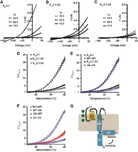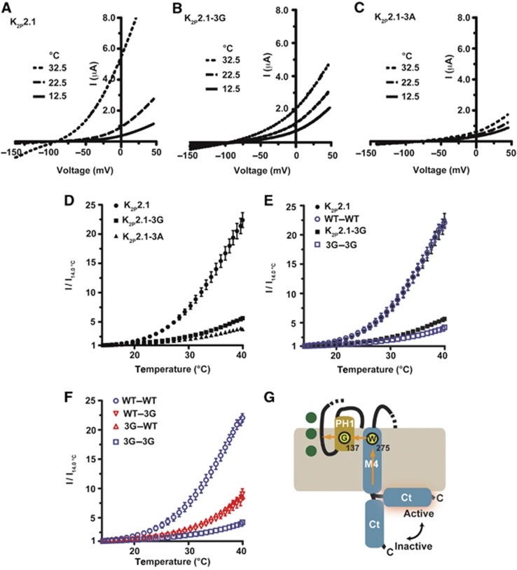 Figure 6. Both C-terminal domains are required for the K2P2.1 (TREK-1) temperature response. (A–C) Exemplar two-electrode voltage clamp recordings of K2P2.1 (TREK-1) (A), K2P2.1-3G (B), and K2P2.1-3A (C) responses to temperature in 2 mM [K+]o pH 7.4. Currents were elicited by a ramp from −150 to +50 mV, from a −80 mV holding potential. (D–F) Quantification of the temperature responses. Data (mean±s.e., n⩾6, N⩾2) was taken at 0 mV and normalized to channel activity at 14°C. (G) Cartoon model of how Ct couples to the C-type gate of K2P2.1 (TREK-1). M4, transmembrane segment 4. Channel elements come from a single subunit. Transmembrane segments M1–M3 and pore helix 2 are not depicted. Dashed regions indicate connections to parts of the subunit that are not shown. Green circles represent potassium ions in the selectivity filter.