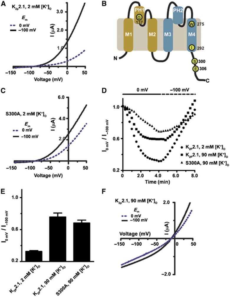 Figure 1. Extracellular potassium antagonizes regulation of K2P2.1 (TREK-1) by membrane potential. (A) Effect of membrane potential (EM) on K2P2.1 (TREK-1) activity in Xenopus laevis oocytes measured by two-electrode voltage clamp in 2 mM [K+]o pH 7.4. Current–voltage (I-V) curves show exemplar voltage-clamp recordings of K2P2.1 (TREK-1) activity after 4 min of holding at −100 and 0 mV, consecutively. (B) Cartoon diagram of a single K2P2.1 (TREK-1) subunit, transmembrane segments 1–4 (M1–M4), pore helix 1 and pore helix 2 (PH1, PH2), and the positions of key residues are indicated. (C) Exemplar I–V curves showing the effect of EM on K2P2.1 (TREK-1) S300A. (D) Channel activity from a representative cell in response to changes in EM. Channel activity was assayed every 15 s by a ramp from −150 to 50 mV. Following current stabilization at −100 mV, EM was changed to 0 mV, and channel activity was assayed by the ramp protocol until current reached minimal values (usually within 4–5 min). Channel activity was reversed by returning EM to −100 mV. Each point represents channel activity from the ramp curves at 0 or +50 mV for 2 mM and 90 [K+]o solutions, respectively. Data presented as fraction relative to activity after initial stabilization at −100 mV. (E) Quantification of maximal inhibition of WT or mutant K2P2.1 (TREK-1) by prolonged incubation at 0 mV (mean±s.e., n⩾6, N⩾2, where ‘n' is the number of oocytes and ‘N' in the number of independent oocyte batches). (F) I–V curves showing exemplar voltage-clamp recordings of K2P2.1 (TREK-1) in 90 mM [K+]o pH 7.4 after stabilization at, consecutively, −100 and 0 mV.