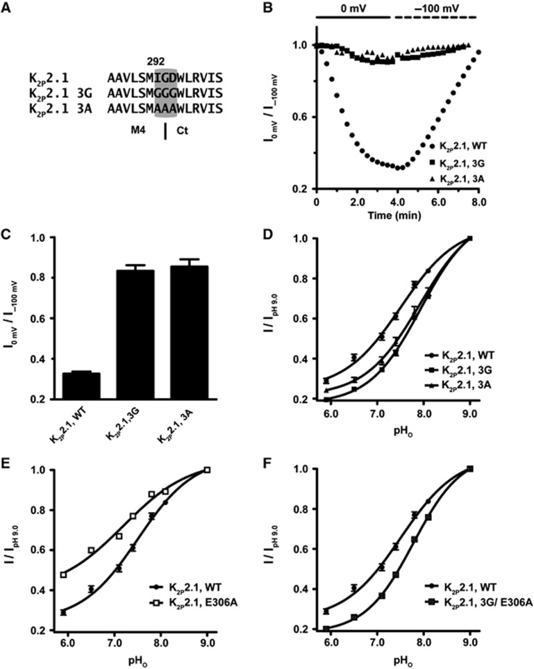 Figure 4. M4–Ct junction is critical for cross-talk between Ct and the C-type gate. (A) Amino-acid sequence of the M4–Ct junction region of K2P2.1 (TREK-1) showing the location of the 3G and 3A mutations. Dashed line indicates a predicted boundary between M4 and Ct. (B) Exemplar time resolution of channel activity from a representative cell in response to fluctuating EM in 2 mM [K+]o pHo 7.4. Each point represents channel activity from the ramp curves at 0 mV. Data presented as fraction relative to activity after initial stabilization at −100 mV. (C) Quantification of maximal K2P2.1 (TREK-1) inhibition by prolonged incubation at 0 mV (mean±s.e., n⩾6, N⩾2). (D–F) Normalized responses of the indicated channels to pHo changes in 2 mM [K+]o. Currents were elicited by a voltage ramp from −150 to +50 mV, from a holding potential of −80 mV. Data (mean±s.e., n⩾6, N⩾2) was taken at 0 mV, normalized to activity at pH 9.0 and fitted to the Hill equation.