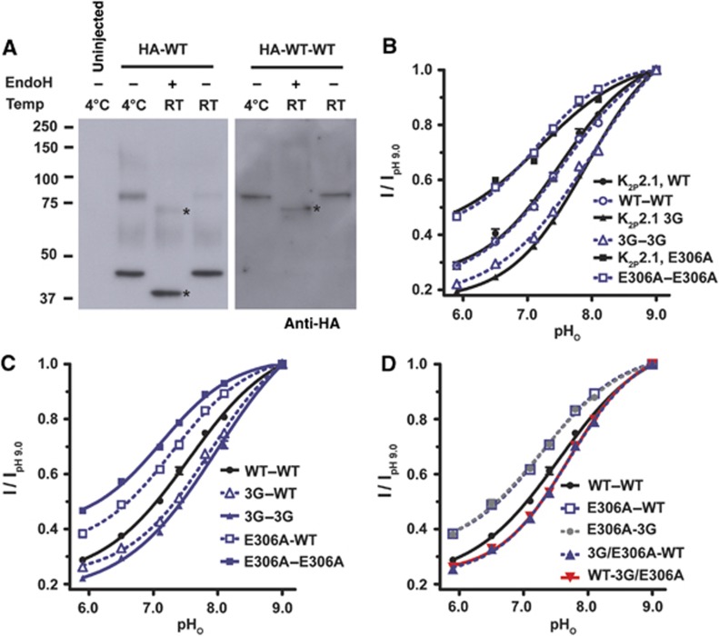 Figure 5. Ct domains act cooperatively to affect K2P2.1 (TREK-1) function. (A) Immunoblot analysis of lysates from oocytes expressing HA-tagged WT, HA-WT or tandem HA-WT-WT K2P2.1 (TREK-1) channels. Lysates were pre-incubated with or without EndoH for 1 h at 4oC or at room temperature (RT). Before electrophoresis, all samples were treated with 2% SDS and 2% β-mercaptoethanol for 15 min at 50oC to dissociate K2P2.1 (TREK-1) subunits. Asterisks denote deglycolyslated forms of WT and tandem channels. (B–D) Normalized responses of the indicated K2P2.1 (TREK-1) channels to pHo changes 2 mM [K+]o. Currents were elicited by a voltage ramp from −150 to +50 mV, from a holding potential of −80 mV. Data (mean±s.e., n⩾6, N⩾2) was taken at 0 mV, normalized to activity at pH 9.0 and fitted to the Hill equation.