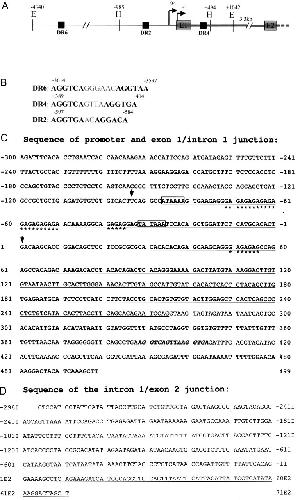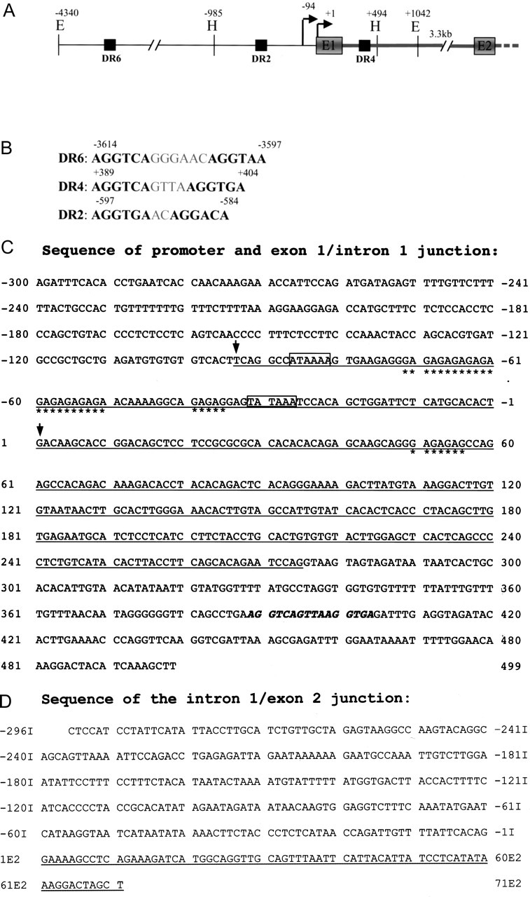 FIGURE 1. Organization of the ST3 promoter region and location of the putative hormone response elements. A, schematic diagram of ST3 gene. There are 3 putative hormone response elements (DR2, DR4, and DR6) flanking the two transcription start sites (arrows) with the major one at â94 and minor one at +1 (35), among which DR6 and DR2 are upstream of the transcription start sites, while DR4 is in the first intron of the ST3 gene. E, EcoRI recognition site; H, HindIII recognition site; E1 and E2, the first and second exon, respectively. B, sequences of the putative hormone response elements. Bold letters represent the half-site of each element in the direct repeats, and the faded letters represent the spacer sequences. The numbers are the relative position to the transcription start site (+1). C, sequences of the promoter region, exon 1, and 5â²-end of intron 1 of X. laevis ST3 gene. The two transcription start sites are indicated by arrows, and the sequence of the first exon is underlined. Boxed sequences are putative TATA boxes, and italic bold letters represent the DR4 element. The GAGA factor binding sites known to be important for promoter function (35) are indicated by asterisks. D, sequences around the junction of intron 1 and exon 2. The first nucleotide of the exon 2 is denoted as 1E2, and the last nucleotide of the first intron is denoted as â1I. The exon sequence is underlined.