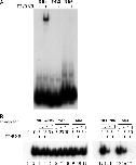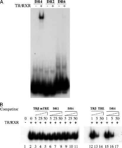 FIGURE 2. DR4 but not DR2 or DR6 element in ST3 gene binds to TR/RXR complex in gel shift assay. A, labeled DR2, DR4, and DR6 elements were incubated with oocyte extract containing overexpressed TR/RXR, and the resulting mixtures was analyzed on a nondenaturing polyacrylamide gel. Note that only DR4 formed a stable complex with TR/RXR. B, specific competition for TR/RXR binding by ST3 DR4 element. Labeled ST3 DR4 element was incubated with TR/RXR extract in the presence of a 0, 5, 25, or 50-fold excess of indicated unlabeled competitors. The resulting mixture was analyzed as above. Note that only the upper band representing the DR4-TR ·RXR complex as seen in A was shown here. TRβ TRE and TRβ mTRE were wild type and mutant TRE (DR4 type) from the T3 regulated X. laevis TRβA gene promoter, respectively (41).