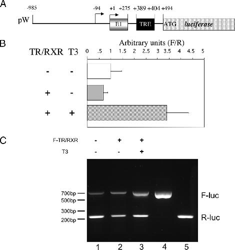 FIGURE 3. T3 up-regulates the ST3 promoter containing the DR4 element in vivo in the context of chromatin. A, schematic diagram of the reporter construct pW with the firefly luciferase reporter gene under the control of the ST3 promoter containing the putative TRE. The arrows indicate the two transcription start sites. E1, exon 1. B, TR/RXR heterodimer activates ST3 promoter in the presence of T3. The pW construct was coinjected with the internal control plasmid phRG-TK driving the expression of Renilla luciferase into the nuclei of the oocytes with or without prior microinjection of mRNAs for FLAG-tagged TR and RXR (TR/RXR) into the cytoplasm. The oocytes were incubated at 18°C overnight in the presence or absence of 100 nm T3 and then subjected to dual luciferase assay. The firefly luciferase activity (F) over the Renilla luciferase activity (R) for each sample, i.e. F/R, was measured and plotted here with the F/R for the oocytes without TR/RXR mRNA microinjection or T3 incubation set to 1 (the actual firefly luciferase activity ranged from 10,000 to 60,000 in different oocyte samples with the background of about 200). C, RT-PCR demonstrates the up-regulation of the reporter mRNA (firefly luciferase (F-luc)) by TR/RXR plus T3. Some of the oocytes as in B were subjected to total RNA isolation. The RNA was made DNA-free and analyzed by RT-PCR for the mRNA levels of firefly luciferase driven by the ST3 promoter. A pair of primers specific for the Renilla luciferase mRNA (R-luc) driven by the coinjected internal control plasmid were included in these RT-PCR reactions. Plasmid DNA pW (lane 4) and phRG-TK (lane 5) were used in PCR reactions as positive controls for Renilla luciferase and firefly luciferase PCR. Note that although the Renilla luciferase transcripts from the T3-independent TK promoter were similar in the presence or absence of TR/RXR and/or T3 (lane 1-3), the firefly luciferase mRNA driving the ST3 promoter was up-regulated in the presence of T3 and TR/RXR (compare lane 3 to lanes 1 and 2).