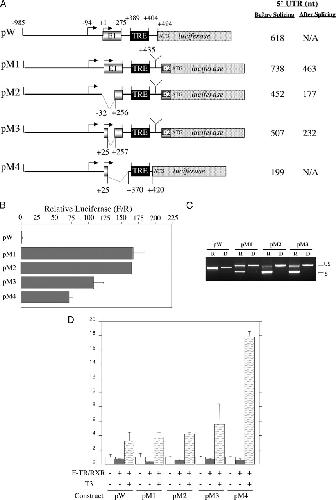 FIGURE 5. Intronic TRE mediates T3 regulation of the ST3 promoter. A, schematic diagram of mutant ST3 promoter constructs. Deletions were introduced into the first intron and/or the first exon of the ST3 gene to produce pM1, pM2, and pM3, all of which contained regions flanking the intron 1/exon 2 junction to allow proper splicing of the primary transcripts. The construct pM4 had an internal deletion in exon 1 and truncation of the first intron. The transcripts from constructs pW and pM4 should not undergo splicing. The total 5â²-UTR nucleotide lengths (nt) (from the major start site at â94) before and after (if applicable) splicing are shown. N/A, not applicable. B, the 5â²-UTR from pW inhibits translation. The constructs in A were co-injected with phRG-TK DNA into the nuclei of the oocytes. The oocytes were incubated at 18°C in an incubator overnight and isolated for dual luciferase assay. The firefly luciferase activity over Renilla luciferase (F/R) from the construct pW was denoted as 1, and the F/R ratios from other constructs were normalized accordingly. Note that all mutated promoter constructs had much higher activity than pW, suggesting that the long 5â²-UTR from pW inhibited translation. C, the primary transcripts from pM1, pM2, and pM3 undergo proper splicing in the oocyte. The plasmids pW, pM1, pM2, and pM3 were injected into oocyte nucleus. The oocytes were incubated at 18°C. Total RNA was then isolated from the oocytes and subjected to RT-PCR analysis. The plasmid DNA for each construct was also amplified for comparison. The bands designated as S and US correspond to spliced and unspliced RNA transcripts, respectively. D, DNA template; R, RNA template. D, all promoter constructs containing TRE respond to T3 similarly. The promoter constructs were coinjected with phRG-TK DNA into the nuclei of the oocytes with or without prior microinjection of FLAG-tagged TR (F-TR)/RXR mRNAs into the cytoplasm. The oocytes were incubated at 18°C overnight in the presence or absence of 100 nm T3 and then isolated for dual luciferase assay. The ratio of the firefly luciferase activity (F) over that of the Renilla luciferase (R) for each sample was normalized again from the oocytes without F-TR/RXR mRNA microinjection or T3 incubation for each promoter construct separately (vertical axis). Note that for all constructs TR/RXR had little or a small repressive effect in the absence of T3 but activated strongly and similarly in the presence of T3. The exception was pM4, which had about 4-fold higher activity, possibly due to the fact that the TRE in this construct is the closest to the transcription start sites.