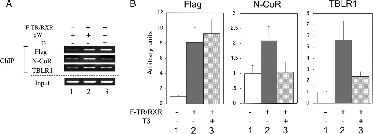 FIGURE 4. TR/RXR binds to the DR4 element in vivo and recruits corepressors to the promoter in the absence of T3. A, oocytes were injected with or without FLAG-tagged TR (F-TR)/RXR and the reporter plasmids and incubated with or without T3 as in Fig. 3. The oocytes were then subjected to ChIP assay using antibodies against the FLAG tag in TR, endogenous N-CoR, or TBLR1. The immunoprecipitates were subjected to PCR with a primer pair flanking the DR4 region to determine the presence of the DR4 TRE sequence. The PCR products were analyzed by agarose gel electrophoresis and visualized with ethidium bromide staining. Oocytes were injected and incubated with or without T3. Aliquots of DNA before antibody immunoprecipitation were amplified as the Input control to show the amounts of DNA in different samples. B, quantitative PCR analysis of the ChIP samples as shown in A. The immunoprecipitated and the Input control DNA as shown in A was analyzed by real-time PCR. The ratio of the precipitated DNA by each antibody to the corresponding Input control is shown here with the ratio in lane 1 set to 1. The results shown here represent the sum of the data from three independent experiments carried out on different days. Note that TR bound to the promoter constitutively (lanes 2 and 3) and recruited N-CoR and TBLR1 in the absence of T3 (lane 2). The addition of T3 dissociated the corepressors (lane 3).