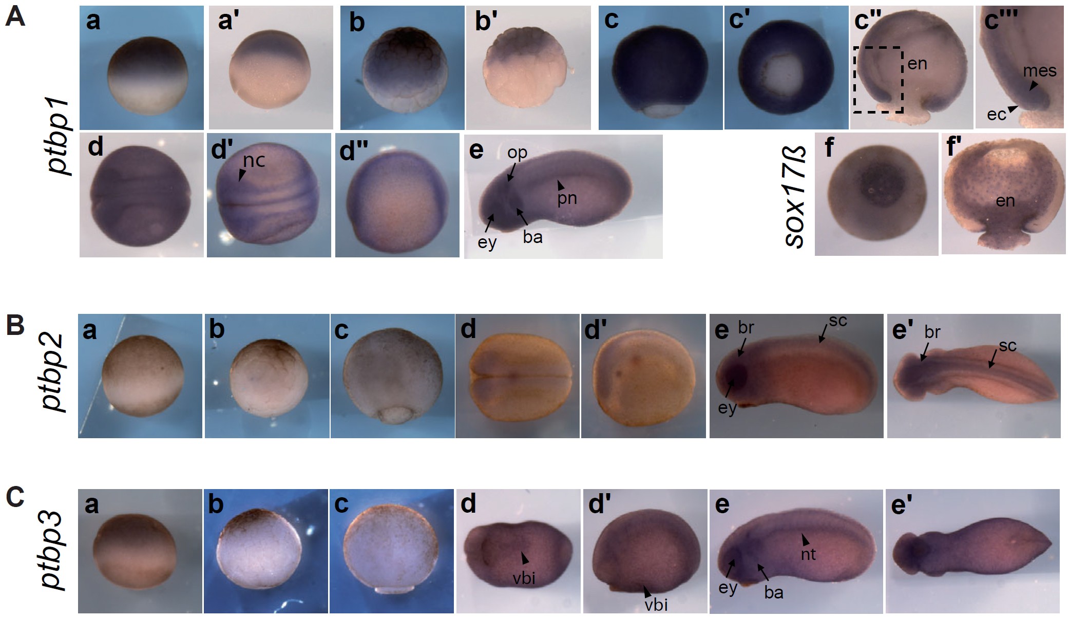 of an early tailbud embryo at stage 24, (e dorsal view of panel e. (C) ptbp3 (a) lateral view of an UFE, (b) lateral view of a blastula, (c) lateral view of a