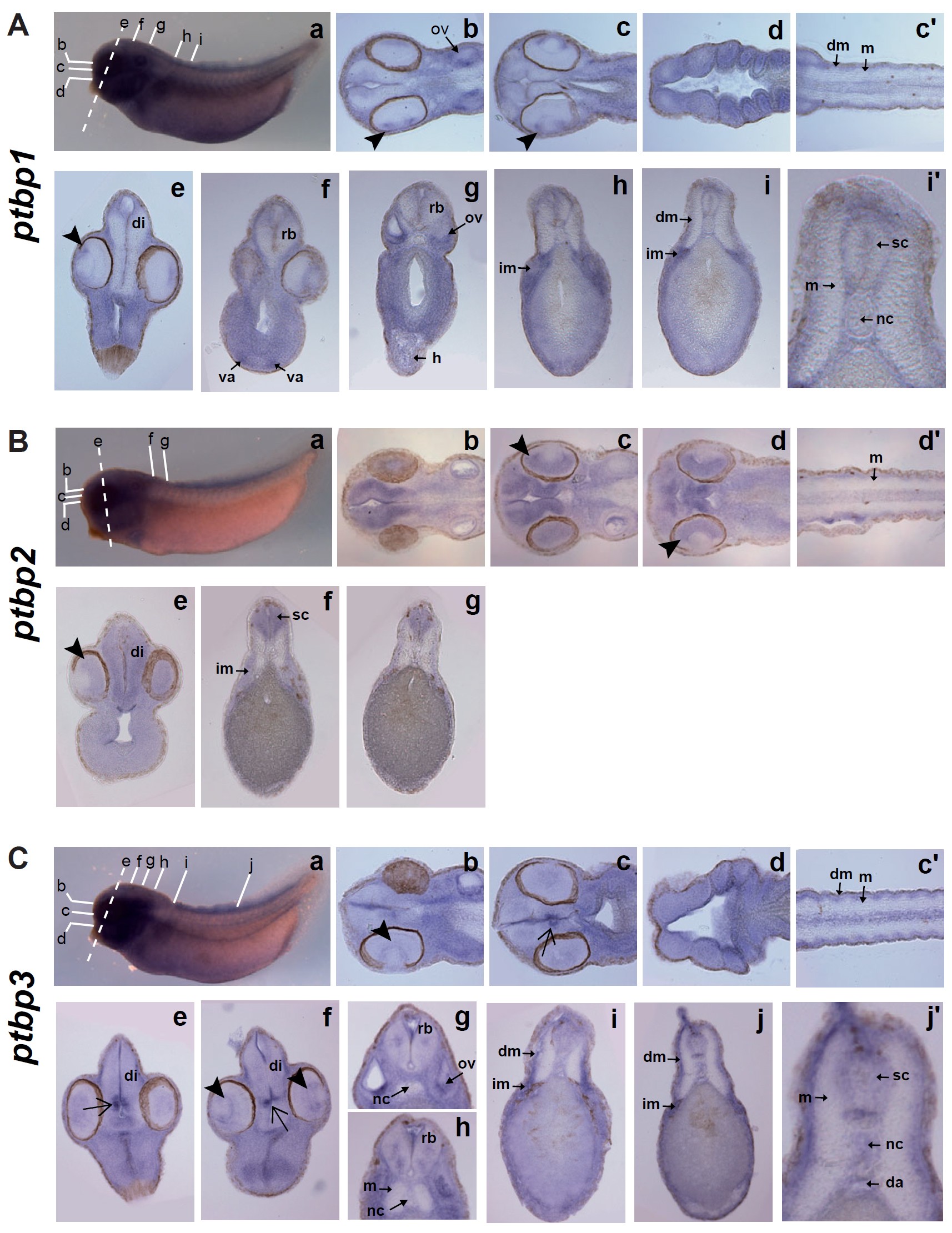 hybridization was performed to study the spatial expression of ptbp1, ptbp2 and ptbp3 at different developmental stages. (A). ptbp1 (a) lateral view
