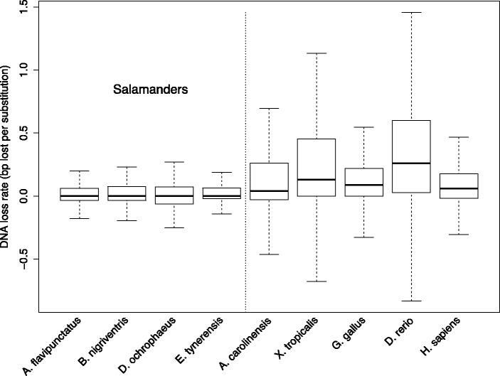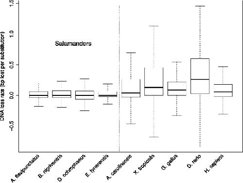 heterogeneous rates of DNA loss across the genome. Outliers are excluded from plot