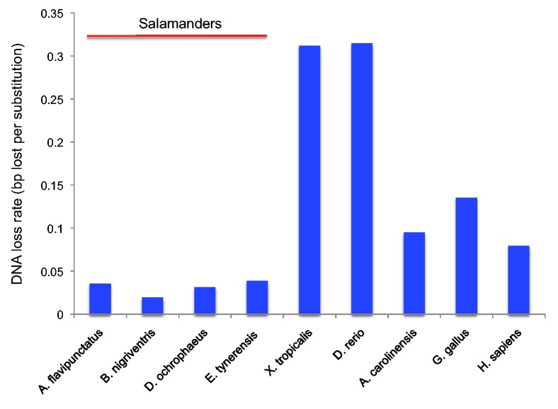 Evolutionary changes in genome size result from the combined effects of mutation, natural selection, and genetic drift. Insertion and deletion mutations (indels) directly impact genome size by adding or removing sequences. Most species lose more DNA through small indels (i.e., ~1-30 bp) than they gain, which can result in genome reduction over time. Because this rate of DNA loss varies across species, small indel dynamics have been suggested to contribute to genome size evolution. Species with extremely large genomes provide interesting test cases for exploring the link between small indels and genome size; however, most large genomes remain relatively unexplored. Here, we examine rates of DNA loss in the tetrapods with the largest genomes-the salamanders. We used low-coverage genomic shotgun sequence data from four salamander species to examine patterns of insertion, deletion, and substitution in neutrally evolving non-long terminal repeat (LTR) retrotransposon sequences. For comparison, we estimated genome-wide DNA loss rates in non-LTR retrotransposon sequences from five other vertebrate genomes: Anolis carolinensis, Danio rerio, Gallus gallus, Homo sapiens, and Xenopus tropicalis. Our results show that salamanders have significantly lower rates of DNA loss than do other vertebrates. More specifically, salamanders experience lower numbers of deletions relative to insertions, and both deletions and insertions are skewed toward smaller sizes. On the basis of these patterns, we conclude that slow DNA loss contributes to genomic gigantism in salamanders. We also identify candidate molecular mechanisms underlying these differences and suggest that natural variation in indel dynamics provides a unique opportunity to study the basis of genome stability.