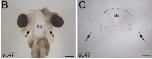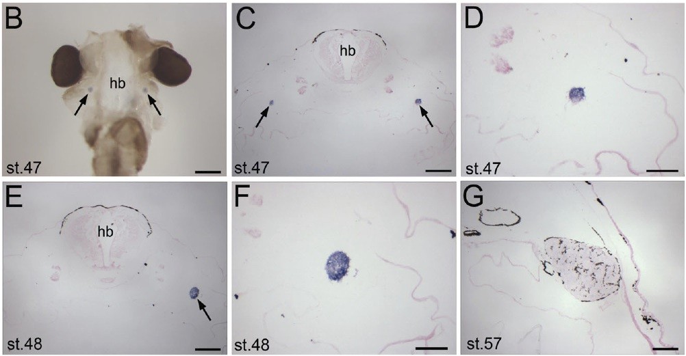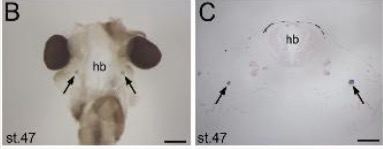Thymus primordium, in X. laevis NF stage 47 tadpole, indicated by arrows, via gene expression of foxn1 (forkhead box N1), visualised via in situ hybridization.( hb is hindbrain ).