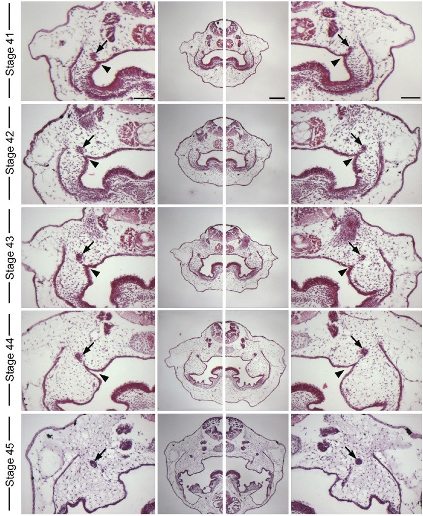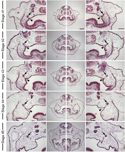 Fig. 2. Early development of the thymus primordia. Histological sections illustrating the formation of the thymus primordium (arrows) from the pharyngeal pouch epithelium (arrowheads) in Xenopus tadpoles at stages 415. For each stage, both sides of the pharyngeal region are shown (lateral panels). The central panels are lower magnification views, composite pictures of both sides. Dorsal bilateral outpocketings of the pharyn- geal epithelium are first visible at stage 41. The thymus primordium is completely separated from the pharyngeal pouch by stage 45. Transverse sections through the hindbrain region at a level posterior to the eye and anterior to the developing inner ear, dorsal to top. The scale bars in the lateral and middle panels 14 100 and 200 mm, respectively.