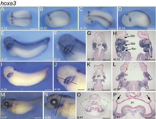 Fig. 4. Developmental expression of hoxa3. A: hoxa3 expression at stage 22 (A,B) and stage 24 (C,D) was restricted to the spinal cord with an anterior boundary of expression corresponding to rhombomere 5. hoxa3 was also expressed in the migrating NC cells. At stage 32 (E) and stage 34 (I), NC cells had colonized the third and fourth pharyngeal arches (IIIV) where they still expressed hoxa3. At this stage, hoxa3 was also detected in the pharyngeal endoderm epithelium of the arches, but was excluded from the mesoderm core. The level of the sections is indi- cated by a black line in F, J, N. At stage 41 (M), the primordium of the thymus emerging from the second pharyngeal pouch was surrounded by hoxa3-negative NC cells (arrows). For whole mount in situ hybridization, anterior to left, dorsal to top except for A, C, which are dorsal view. G, H, K, L are longitudinal sections, anterior towards the top. O, P are transverse sections, dorsal to top. ph, pharynx; pp, pharyngeal pouches; IIV, pharyngeal arches. In each panel, the stage is indicated in the lower left corner. The scale bars in (A, I, and M) 1â4 500 mm; (F, J, and N) 1â4 250 mm; (G, K, and O) 1â4 200 mm; (H, L, and P) 1â4 100 mm.