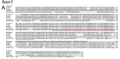 Fig. 5. Sequence and developmental expression of foxn1. A: The deduced amino acid sequences of Foxn1 from human, mouse, chicken, and zebrafish were aligned using ClustalW2 and compared to the partial amino acid sequence of Xenopus laevis Foxn1. The highly conserved fork- head domain is underlined