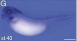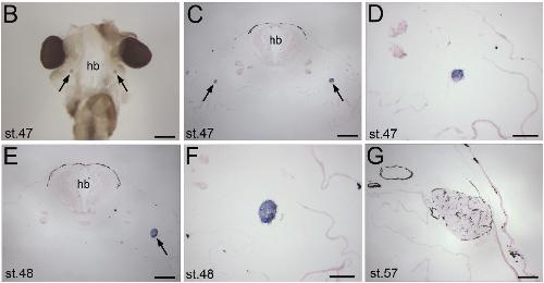 Fig. 5. Sequence and developmental expression of foxn1. B: By whole mount in situ hybridization, foxn1 was first detected at stage 47 (arrows) lateral to the hindbrain (hb). In situ hybridization on transverse sections of stage-47 (C,D) and stage-48 (E,F) tadpoles. foxn1 was completely restricted to the thymus primordium (arrows). foxn1 expression in the thymus persisted at least up to stage 57 (G), at which stage foxn1 was weakly detected throughout the entire organ. D, F are higher magnification views of the thymus primordium shown in C, E, respectively. In each panel the stage is indicated in the lower left corner. The scale bar (B) 1â4 500 mm; (C, E, and G) 1â4 200 mm; (D and F) 1â4 200 mm.