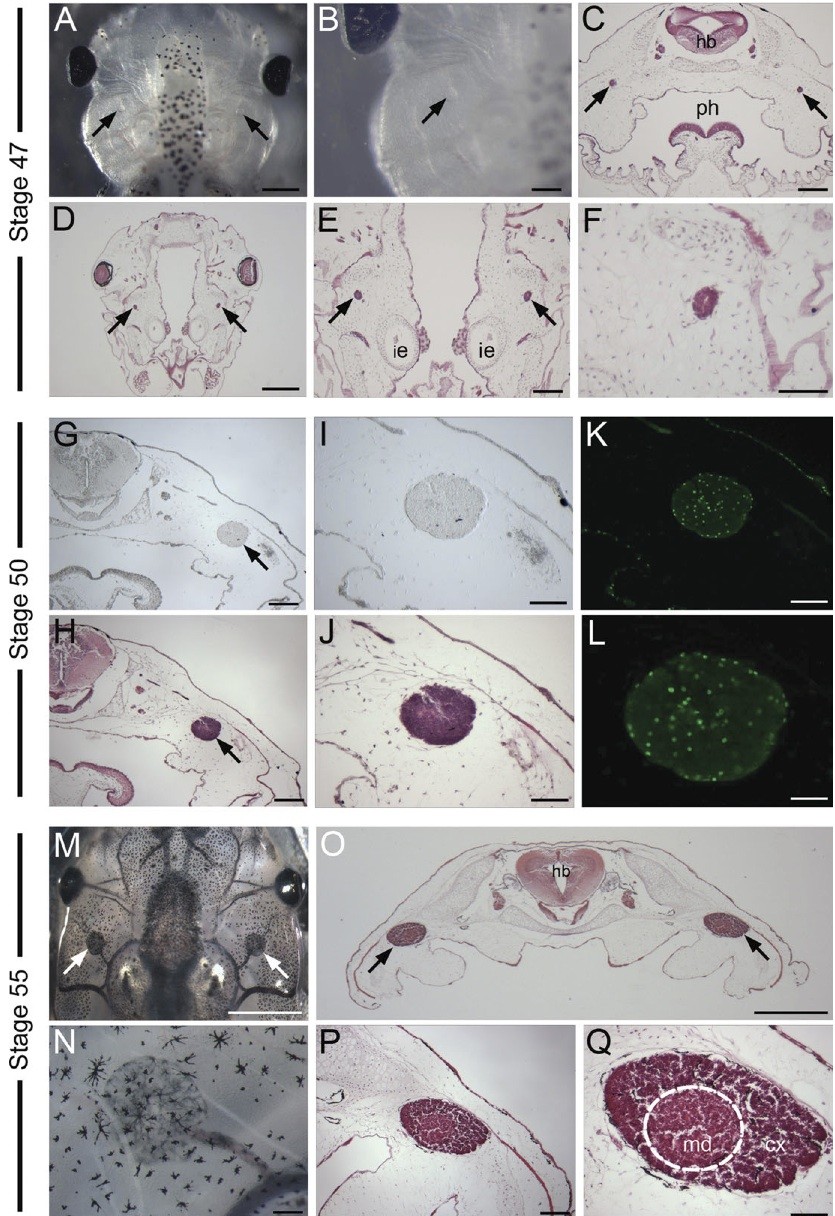 Fig. 1. Developmental anatomy of the thymus. A: The thymus primordia are recognizable at around stage 47 (arrows). C: Transverse section of a stage-47 tadpole, at the level of the pharynx (ph); dorsal towards the top. The thymus primordia (arrows) are located lateral and ventral to the hindbrain (hb), between the eye and the developing inner ear (ie), as seen on a longitudinal section (D). F: Higher magnification view of the right thymic primordium shown in E. Longitudinal section of a stage-47 tadpole, anterior towards the top. G: At stage 50, the thymus primordia have increased in size but retained their dorsolateral position (arrows). G, I: Phase contrast. H: Hematoxylin and eosin staining of the same section. K,L: Expression of p63, an epithelial stem cell factor. I,J are a higher magnification view of G,H. L is a higher magnification view of K. Transverse sections, dorsal towards the top. M,N: At stage 55, the thymus has been extensively colonized by the NC-derived pigment cells (arrows). N is a higher magnification view of the thymus shown in M. Dorsal views, anterior toward the top. O: On a transverse section, the cortex (cx) and me- dulla (md) of the thymus are now clearly distinguishable. The dashed circle outlines the medulla in Q. P and Q are higher magnification views of O. Scale bars (A, D) 1â4 500 mm; (B, C, E, G, H, N, P) 1â4 200 mm; (F, I, J, K, Q) 1â4 100 mm; (M) 1â4 2 mm; (O) 1â4 1 mm.