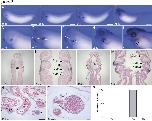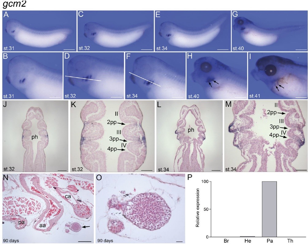 Fig. 3. Developmental expression of gcm2. A,B: gcm2 was first detected at stage 31 by whole mount in situ hybridization in two longitudinal stripes in the pharyngeal region. At stage 32 (C,D) and stage 34 (E,F), gcm2 was now expressed in three distinct stripes. At stage 40 (G,H) and by stage 41 (I), gcm2 expression appeared to be confined to the developing gills (arrows). A: Lateral views, dorsal towards the top, anterior to the left. B, D, F, H are higher magnification views of the embryos shown in A, C, E, G. In situ hybridization on longitudinal sections of stage-32 (J,K) and stage-34 (L,M) embryos confirmed the expression of gcm2 in the endoderm and ectoderm components of the second, third, and fourth pha- ryngeal arches, with stronger expression in the third arch. For J,K and L,M, the level of the section is indicated by a white line in D and F, respec- tively. In J, anterior towards the top. N,O: Hematoxylin and eosin staining of a section through the thoracic region of a 3-month-old (90 days) froglet. The parathyroid (arrow) was located in the vicinity of the aortic arch arteries. O is a higher magnification view of the parathyroid shown in N. aa, aortic arch artery; ca, carotid artery; pa, pulmonary artery; ph, pharynx; pp, pharyngeal pouches; IIV, pharyngeal arches. In each panel, the stage/age is indicated in the lower left corner. The scale bars (A, C, E and G) 1â4 500 mm; (B, D, F, H, and I) 1â4 250 mm; (J, L, and N) 1â4 200 mm; (K, M, and O) 1â4 100 mm. P: In 3-month-old froglets, Gcm2 was specifically detected in the parathyroid (Pa) by real time RT-PCR, while in other tis- sues, including brain (Br), heart (He), and thymus (Th), gcm2 was essentially undetectable.