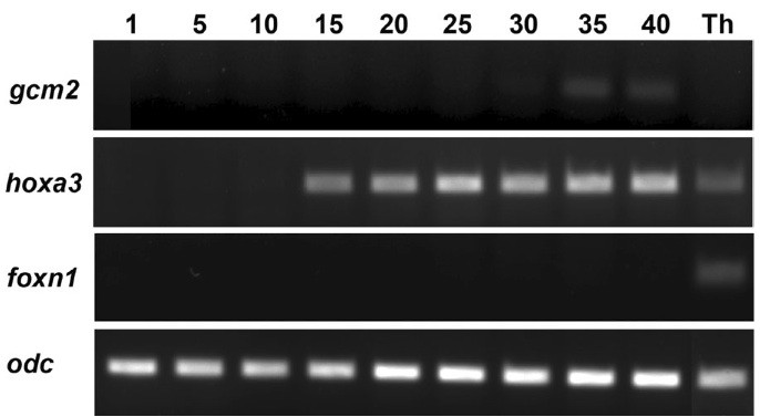 Fig. 6. RT-PCR analysis of the developmental expression of hoxa3, gcm2, and foxn1. The stages are according to Nieuwkoop and Faber (1967). Th, thymus from stage-55 tadpoles. Orni- thine decarboxylase (odc) is shown as a loading control.