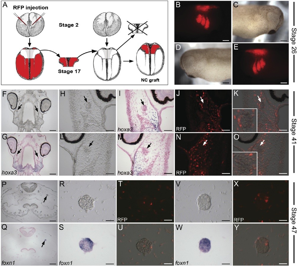 Fig. 7. NC contribution to the thymus. A: Experimental design to analyze the NC contribution to the thymus. Two-cell-stage embryos were injected in the animal pole with mRNA encoding Red Fluorescent Protein (RFP). At stage 17, the RFP-labeled cardiac NC was transplanted onto the same region of an unlabeled host embryo (NC graft). B: RFP-labeled NC graft at stage 26. Lateral views of the same embryo. Dorsal towards the top, anterior to the right (B,C) and left (D,E). Cells derived from the RFP-labeled NC graft were confined to the three most posterior streams of cranial NC, as previously described (Lee and Saint-Jeannet, 2011). At stage 41 (F), cells derived from the RFP-labeled NC graft (JO) formed most of the head mesenchyme, surrounding the thymus primordial (arrows). A fraction of the RFP-labeled NC cells also express hoxa3; however, these cells remained confined to a region posterior to the thymus primordia (G, I, M, J, N). H, L are higher magnification of F. I, M are higher magnification of G. Longitudinal sections, anterior towards the top. K and O are overlay of H and L, respectively. Insets in K, O are higher magnification views of the thymus primordia (arrows). P: At stage 47, the thymus primordia can be identified by Foxn1 expression (Q, S, W). A small number of RFP-labeled NC cells have colonized the thymus (T, U, X, Y). R are higher magnification views of the thymus primordium (arrows) in P, Q. R and V show two representative tadpoles form two independent experiments. U and Y are overlay of R and V, respec- tively. The scale bars (B, P, and Q) 1â4 200 mm; (H and R) 1â4 50 mm.