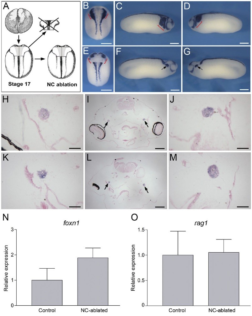 Fig. 8. NC cells are dispensable for thymus development. A: Diagram illustrating cardiac NC ablation at stage 17. B: sox10 expression in con- trol and NC-ablated embryos at stage 17 (B and E), and stage 25 (C,D and F,G). The red brackets in control (B) and NC-ablated (E) embryos indi- cate the position of cardiac NC territory ablated at stage 17. NC ablation resulted in the bilateral loss of the three most posterior NC streams at stage 25 (F,G) as compared to control (red brackets in C and D). In NC-ablated embryos, sox10 expression in the otic vesicle is unaffected (arrows). B and E are dorsal views, anterior to top. C and D (control) and F and G (NC-ablated) are showing both sides of the same embryo. Dor- sal to top, anterior to right (C and F) or to left (D and G). H: Transverse sections (dorsal to top) through two stage-47 tadpoles (H and K) following NC ablation at stage 17. foxn1 expression was detected in the thymus primordia of both tadpoles. H, J and K, M are higher magnifica- tion views of the thymi shown in I and L, respectively. I, L: The arrows point to the thymus primordia expressing foxn1. The scale bars in (B) 1â4 500 mm; (H, J, K, and M) 1â4 50 mm; (I and L) 1â4 200 mm. N,O: The thymi of control (n1â49) and NC-ablated (n1â49) tadpoles were dissected at stage 48 and analyzed by real time RT-PCR for foxn1 (N) and rag1 (O) expression. foxn1 and rag1 expression was normalized to the expression of the TEC-specific marker, keratin 8. Statistical significance was determined using the t-test. The values are presented as mean SEM.