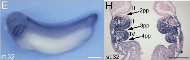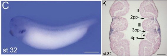 hoxa3 (homeobox A3) gene expression in Xenopus laevis embryo, assayed via in situ hybridization, NF stage 32,dorsal view, anterior left, dorsal up, and longitudinal section, anterior up.