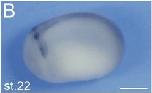 hoxa3 (homeobox A3) gene expression in Xenopus laevis embryo, assayed via in situ hybridization, NF stage 22,dorsal view, anterior left, dorsal up.