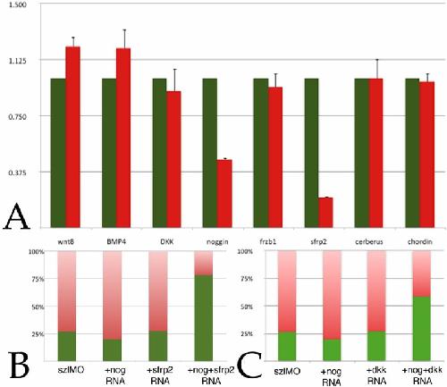 (A) The DLMZ region (at stage 11) was isolated from C2/C3 sizzled morphant embryos and subjected to qPCR analysis. Compared to control DLMZs (green), sizzled morphant DLMZs (red) showed small but reproducible increases in wnt8 and bmp4 RNA levels, and reproducible decreases in noggin and and sfrp2 RNA levels. (B) We then examined the ability of injection of noggin and sfrp2 RNAs, either alone or together, to rescue the sizzled C2/C3 morphant sox9 phenotype: neither was effective alone, but in combination they produced a robust rescue. Green bars indicated rescued embryos, red bars indicate loss of sox9 expression. (C) Given that SFRP2 may have both anti-Wnt and anti-BMP activities, we examined the behavior of the ureWnt antagonist Dkk. As before, neither noggin or dkk RNAs alone rescued, but together they produced a greater than 50% rescue of sox9 expression.