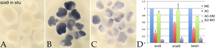 Ectodermal explants were isolated from stage 8/9 embryos and cultured either alone (A) or together with DLMZ explants, isolated from stage 10 wild type (B) or sizzled C2/C3 morphant (C) embryos. When control embryos reached stage 18, explants were stained in situ for sox9 RNA. In similar studies (D), explants were analyzed when control embryos reached stage 11 by qPCR for levels of sox9, snail2, or twist1 RNAs. Levels of these RNAs in whole embryos (WE), animal caps (AC), control animal cap-dorsal mesoderm (AC-DM) or control animal cap-sizzled morphant dorsal mesoderm (sizzled MO) were compared.