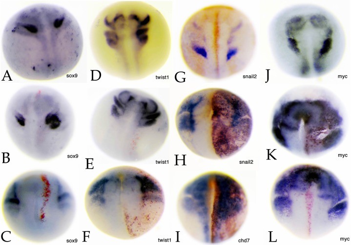 The effects of sizzled over-expression were complex, as illustrated when the effects of injecting low (200 pgs/embryo) or high (600 pgs/embryo) amounts of sizzled-HA RNA into one blastomere of two cell embryos (control, uninjected side to the left in all images.) At stage 18, the effects on the expression of sox9 ((A)-control, (B)-low, (C)-high) and twist1 ((D)-control, (E)-low, (F)-high), snail2 ((G)-control, (H)-high), chd7 ((I)-high), and c-myc ((J)-control, (K,L)-high) were analyzed. In embryos injected with 200 pgs of Sizzled-HA RNA the sox9 expression domain was altered in 27 of 30 embryos (B); the twist1 expression domain was altered in 26 of 31 embryos (E); the snail2 expression domain was altered in 26 of 30 embryos (G); and the chd7 expression domain was altered in 19 of 24 embryos (data not shown). In embryos injected with 600 pgs of Sizzled-HA RNA, the sox9 expression domain was altered in 21 of 24 embryos (C); the twist1 expression domain was altered in 19 of 22 embryos (F); the snail2 expression domain was altered in 22 of 26 embryos (H); the chd7 expression domain was altered in 16 of 18 embryos (I); and the c-myc expression domain was altered in 24 of 28 embryos (K,L). Red-brown staining indicates lacZ staining due to co-injected LacZ RNA (used as a lineage marker).