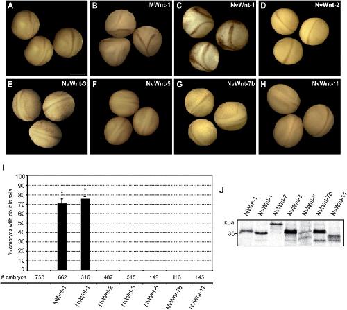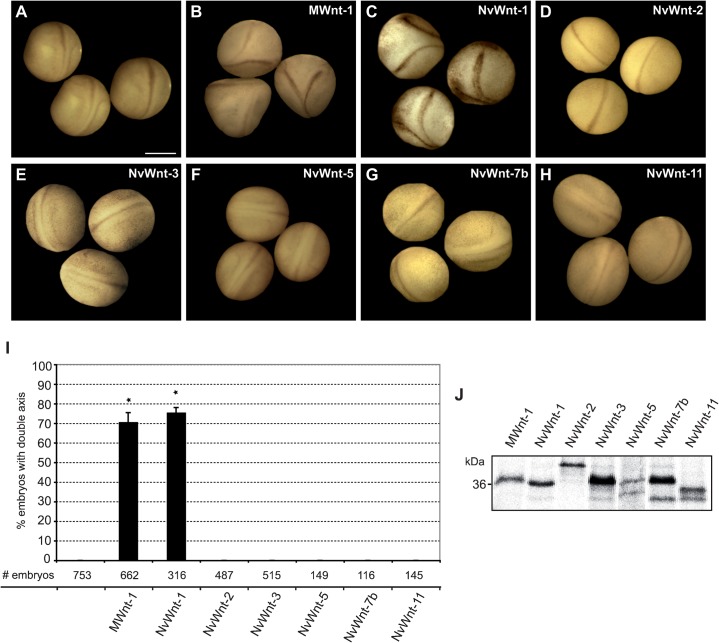 Fig. 1. NvWnt-1 has an axis induction capacity in Xenopus.(A) Wildtype embryos stage 20. Double axis formation with (B) MWnt-1 (20 pg) and (C) NvWnt-1 (200 pg) but not with (D) NvWnt-2 (500 pg), (E) NvWnt-3 (500 pg), (F) NvWnt-5 (400 pg), (G) NvWnt-7b (500 pg) and (H) NvWnt-11 (200 pg). (I) Quantification of embryos with double axes. (J) Radioactive TNT assay shows the successful synthesis of all used Wnt constructs. # number, *p<0.005 to wildtype embryos. Error bars indicate standard error; scale bars 900 μm.