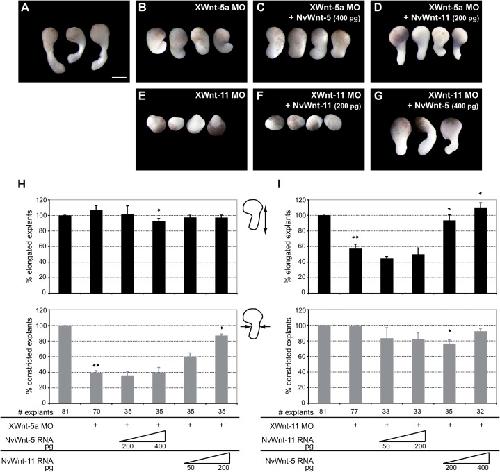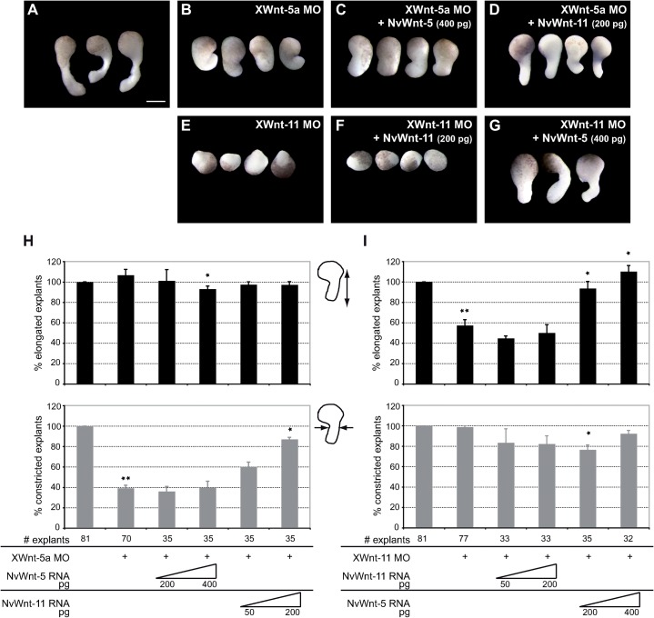 Fig. 3. NvWnt-5 and NvWnt-11 show inverse concentration-dependent noncanonical activities in Xenopus.(A) Wildtype DMZ explants with normal elongation and constriction. XWnt-5a MO explants elongate without constriction (B) and cannot be rescued by NvWnt-5 (C), but by NvWnt-11 expression (D). (E) XWnt-11 MO explants with blocked elongation that is rescued by NvWnt-5 (G) but not by NvWnt-11 (F). (H, I) Quantification of elongated DMZ explants (black) and elongated DMZ explants showing normal constriction (gray). # number, **p<0.005 to wildtype DMZ explants, *p<0.005 to MO DMZ explants. Error bars indicate standard error; scale bars 750 μm.
