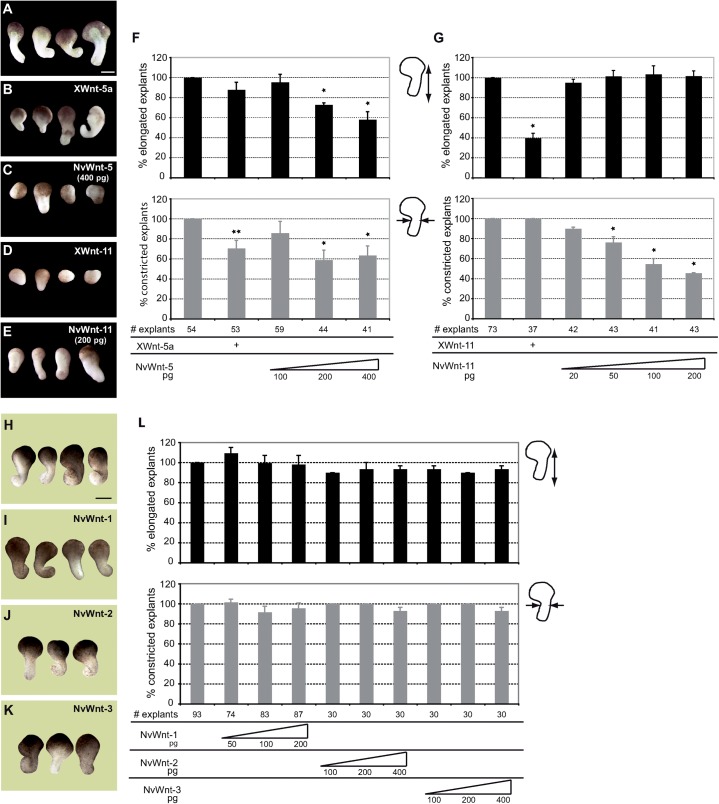 Fig. 2. NvWnt-5 and NvWnt-11 act in noncanonical Wnt-signaling by disturbing convergent extension movements.(A; H) Wildtype DMZ explants with normal elongation and constriction. (B) XWnt-5a (100â pg) overexpression impairs constriction of DMZ explants, while (D) XWnt-11 (20 pg) overexpression completely inhibits their elongation. (C) NvWnt-5 expression has both an effect on constriction and elongation. (E) NvWnt-11 expressing DMZ explants elongate but the constriction fails. (I) NvWnt-1 (200â pg), (J) NvWnt-2 (400â pg) and (K) NvWnt-3 (400â pg) expressing DMZ explants show normal elongation and constriction. (F, G, L) Quantification of elongated DMZ explants (black) and of elongated DMZ explants showing normal constriction (gray). # number, *p<0.005 to wildtype DMZ explants, **p<0.05 to wildtype DMZ explants. Error bars indicate standard error; scale bars 750 μm.