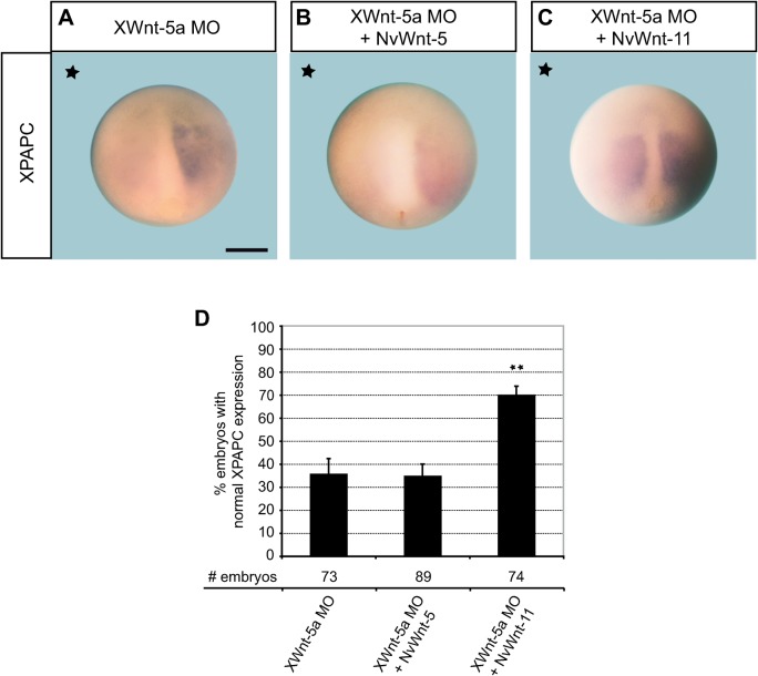 Fig. 4. NvWnt-11 rescues XPAPC expression in XWnt-5a morphants.XPAPC ISH of single-side injected (*) Xenopus embryos (stage 12.5). (A) Depletion of XWnt-5a leads to reduction of XPAPC expression. (C) Coinjection of NvWnt-11 (200â pg), (B) but not of NvWnt-5 (400â pg) rescues XPAPC expression. (D) Quantification of embryos with normal XPAPC expression. # number, **p<0.005 to MO. Error bars indicate standard error; scale bars 460 μm.