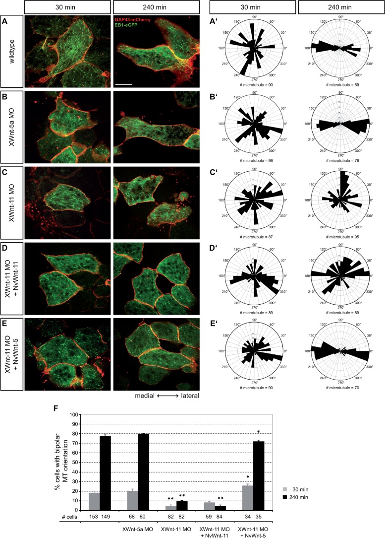In vivo imaging of microtubule growth and cell polarization in DMZ explants expressing EB1-eGFP (500â pg) and GAP43-mCherry (200â pg). Scale bar 20â μm. (Aâ²âEâ²) Microtubule growth directions of the indicated cells statistically rendered in rose diagrams. (AâE, Aâ²âEâ²) 30 minutes after explant isolation (stage 10.25) microtubules grow from the cell centre in all directions. After 4 hours (stage 12.5), microtubule growth gets bipolar (A, Aâ²) in control and (B, Bâ²) in XWnt-5a depleted explants, while (C, Câ²) in absence of XWnt-11 microtubules keep on growing in all directions. (E, Eâ²) NvWnt-5 (400â pg) but not (D, Dâ²) NvWnt-11 (200â pg) expression in XWnt-11 morphants rescues microtubule orientation. (F) Quantification of cells with bipolar microtubule orientation. # number, **p<0.005 to wildtype, *p<0.005 to MO. Error bars indicate standard error.