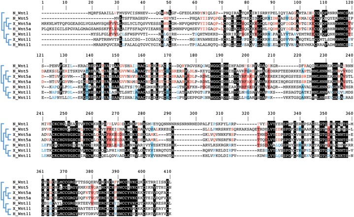 Fig. 6. Alignment of vertebrate and Nematostella noncanonical and canonical sequences.The evolutionary conserved backbone of Wnt residues is indicated by black bars. Wnt-5 specific residues are drawn in red, Wnt-11 specific in blue. ‘Crosshomology’ is indicated by red bars for the Wnt-5 subfamily and blue bars for the Wnt-11 subfamily. Note that some of the Wnt-5 or Wnt-11 specific residues are also shared by the canonical NvWnt-1 (outgroup). (For further details see text).