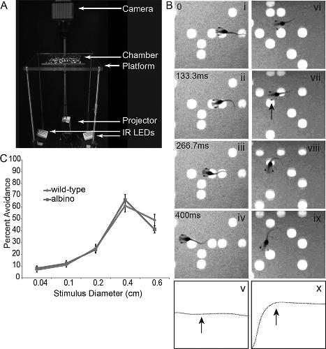 Fig. 1. Xenopus laevis tadpoles exhibit an avoidance response to moving stimuli. A: Visual avoidance behavior apparatus. Animals are placed in the chamber and a moving stimulus is presented from below. Video images are captured from above. B: Still frames of a video sequence showing stage 47 tadpoles' behavioral response to the upward moving stimulus (66.67 ms/frame, every other frame is shown). Tadpoles do not respond to stationary dots (B, iâiv, left panels) and swim in a straight trajectory, as shown in the drawing (B, v). In contrast, tadpoles exhibit an avoidance behavior in response to moving stimuli (B, viâix, right panels) and abruptly change their trajectory upon an encounter with a perpendicularly approaching dot, indicated by arrow in the drawing of the swim trajectory (B, x). Time stamps shown in panels Biâiv also correspond to Bviâix. C: Both pigmented and albino tadpoles similarly display a strong avoidance behavior to a stimulus size of 0.4 cm in diameter (n = 12 animals each).