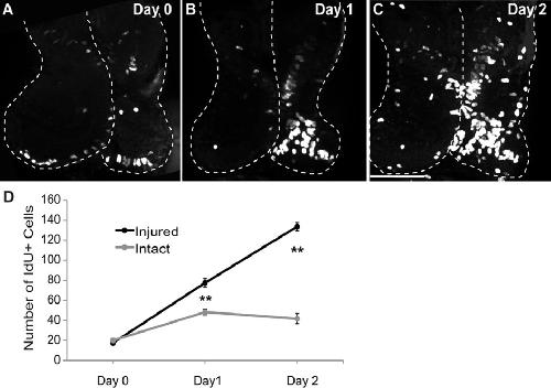 Figure 5. Cell Proliferation increases after injury. The right tectal lobe of stage 47 tadpoles was injured and changes in cell proliferation were assessed by exposing animals to IdU for 2 hours. Data were analyzed as individual optical sections, but are presented as confocal Z-projections of the entire tectum from whole-mount brains. AâC: IdU incorporation in the tectum 2 hours after injury (A), 24 hours after injury (B), and 48 hours after injury (C). D: Total cell counts of IdU-positive cells per tectal lobe in the injured vs. intact tectum over a 48-hour period after injury. n = 15 animals total (5 for each timepoint), **P < 0.01. Data are average ± SEM. Scale bar = 100 μm.