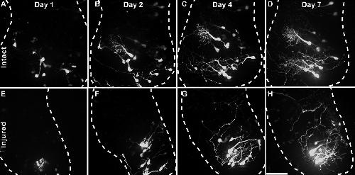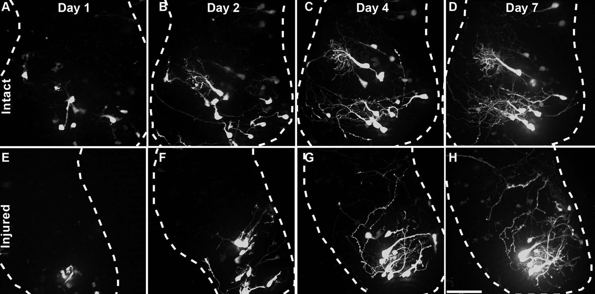 Figure 8. Tectal cells generated after injury differentiate into neurons. In vivo time-lapse images of tectal cells labeled by expression of turboGFP in Sox2-expressing neural progenitors cells at the time of injury. Time-lapse images of the uninjured (A–D) and injured (E–H) tecta collected 1, 2, 4, and 7 days after injury are shown. Scale bar = 70 μm.