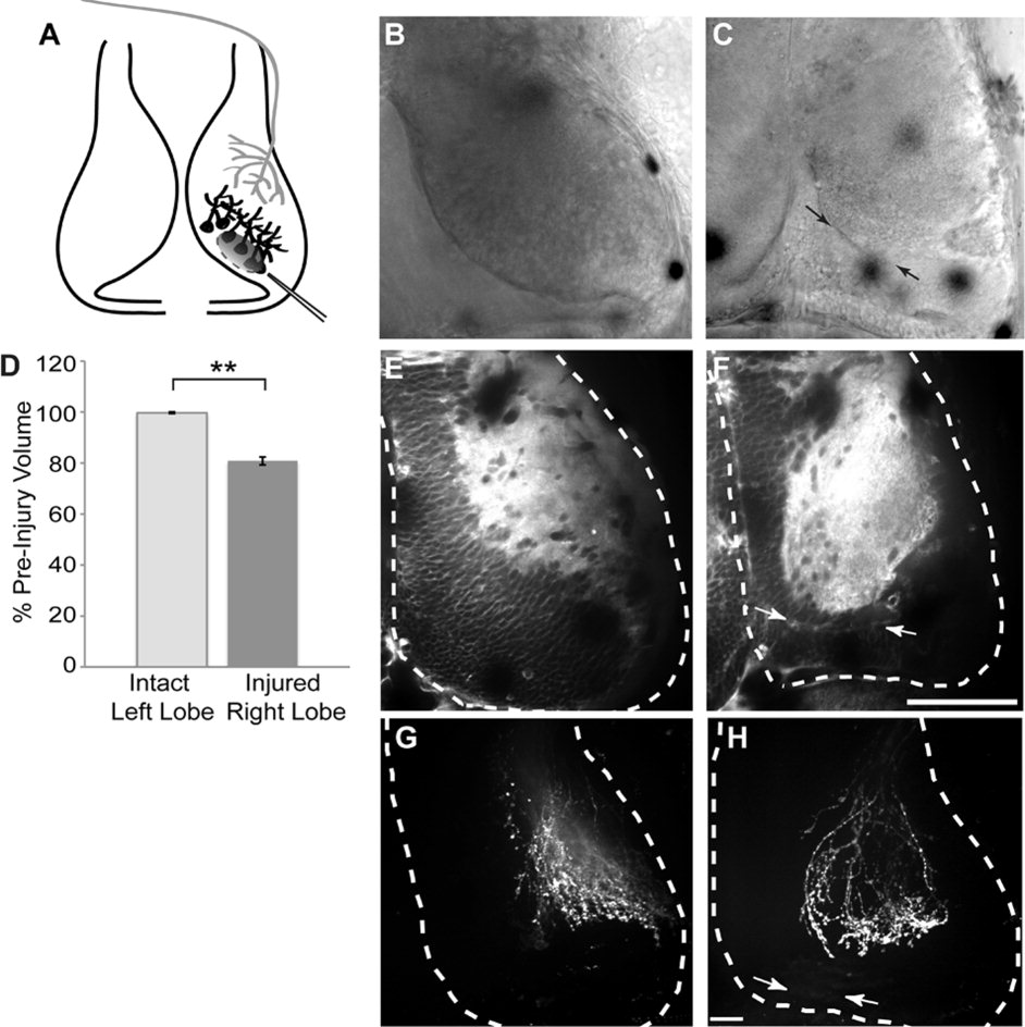 Unilateral injury to the optic tectum. A: Schematic of the injury paradigm. Stage 47 tadpoles were surgically injured by aspirating a focal region of optic tectal cells (black) from the caudal right tectal lobe, caudomedial to the region of retinal axon innervation (gray). B,C: DIC images show the tectal lobe before surgery (B) and after surgery (C). Arrows in C indicate wound area. D: Quantification of the tectal volumes before and after surgery. Surgery decreases the volume of the right tectal lobe without affecting the volume of the left tectal lobe. n = 16 animals, P < 0.01. E,F: Single optical sections of fluorescent FM4-64 membrane dye labeling before (E) and after surgery (F). The tectal lobes are outlined in white. The injury site in the right lobe was between the arrows. G,H: DiI labeling of the RGC axons in intact (G) and injured (H) tecta. Injury does not alter gross morphology of the RGCaxon arbors. Scale bars = 100 μm in BâF; 30 μm in G,H.
