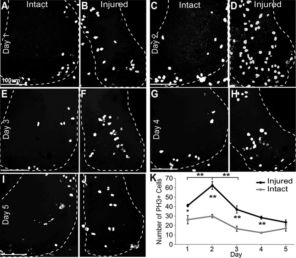 Fig. 4. Phospho-histone 3 (PH3) immunoreactivity increases after injury. The right tectal lobe of stage 47 tadpoles was injured and changes in cell division were assessed in the right and left tectal lobes by immunolabeling for PH3 over the course of 5 days to identify dividing cells in M phase of the cell cycle. Data were analyzed as individual optical sections, but are presented as confocal Z-projections of the tectal lobes, which are outlined. AâJ: PH3 labeling of dividing cells in the tectal lobes 24 hours (A,B), 48 hours (C,D), 3 days (E,F), 4 days (G,H), and 5 days (I,J) after injury in the intact left tectal lobe (A,C,E,G,I) and in the injured right tectal lobe (B,D,F,H,J) of the same animals. K: Total counts of PH3-labeled nuclei in the injured (black line) and intact (gray line) tecta over a 5-day period after injury. n = 25 animals total (5 for each timepoint). *P < 0.05, **P < 0.01, n.s. = not significant. Data are average ± SEM. Scale bars = 100 μm.
